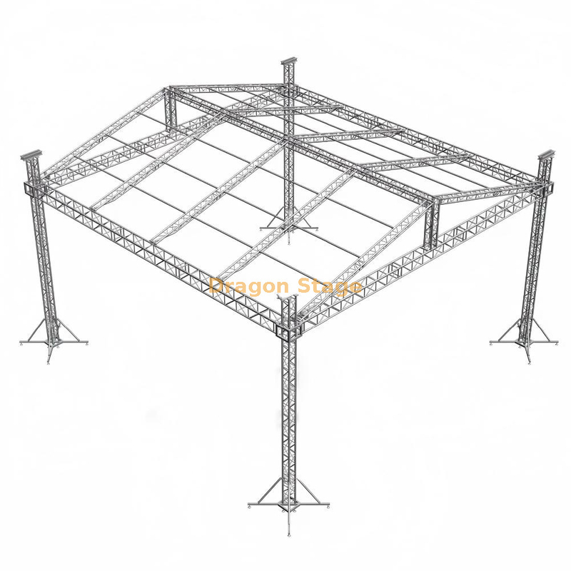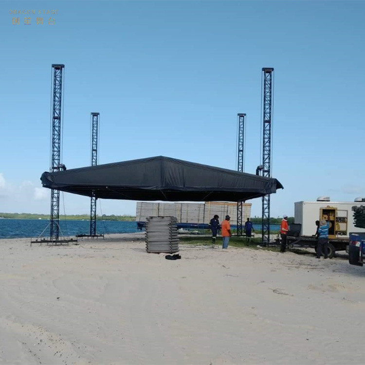 该系统顶部有一个重型阻燃 PVC 顶篷,其特点是倾斜设计,以便在降雨期间立即排出水。这种经过保护设计的环境与我们的模块化铝制舞台甲板完美兼容,可以调节高度,为任何观众规模创造理想的视线(来源: https://www.dragontruss.com/Aluminum-Stage-Platform-pd463987768.html )。