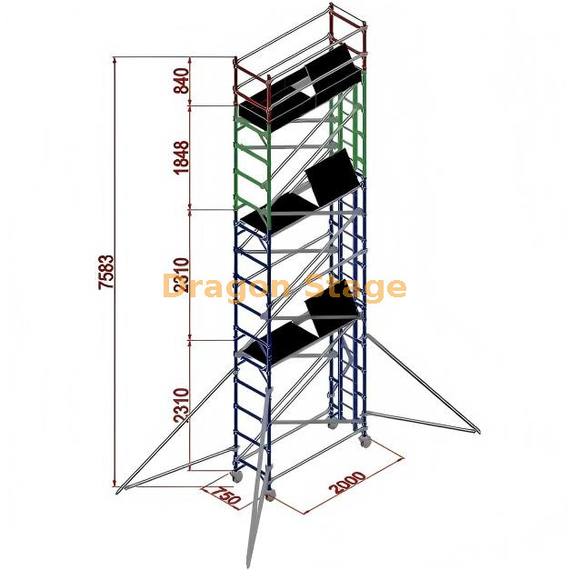 这款专为专业舞台、活动设置和建筑应用中的多功能性和可靠性而设计, 0.75x2x7.53M 铝制定制支架单脚手架塔 将轻质耐用性与精密工程相结合。它采用优质 铝 6061-T6制成,具有卓越的强度重量比、耐腐蚀性,并且符合欧洲标准 HD1004,即使在苛刻的环境下也能确保安全性和使用寿命。