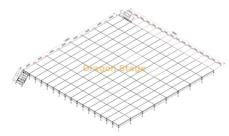 这个宽敞的 19.52 mx 19.52 m 铝制舞台系统提供了坚如磐石、完全模块化的表演平台,非常适合大型音乐会、节日、户外仪式和大型企业活动。采用标准 1.22 米 x 2.44 米(4 英尺 x 8 英尺)防风雨舞台甲板建造,配有铝制框架和胶合板顶部,由真正的腿支撑(可调节高度通常为 0.4-2.0 m),它提供卓越的负载能力和快速组装。