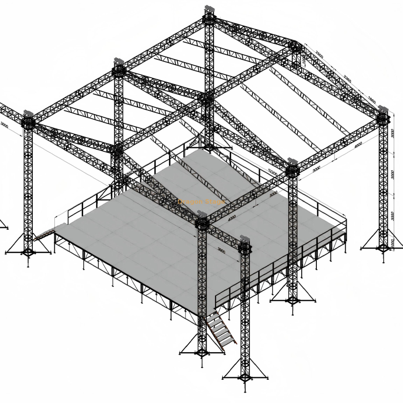 Premier 14m x 14m 室外三角形屋顶桁架系统, 高度 10m。采用强化 4 柱地面支撑设计、双 3m 宽扬声器翼和大容量斜屋顶。专为需要大量垂直间隙和卓越天气保护的大型户外节日、音乐会和重大活动而设计。