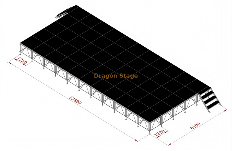 Dragon Stage 的这款专业级 13.42mx 6.1m(44 英尺 x 20 英尺)户外移动舞台专为高负载、大型音乐会、节日和活动而设计。它具有坚固的 6061 铝合金框架、用于视听设备的集成照明桁架以及可定制的表面选项,所有这些都专为快速组装而设计。