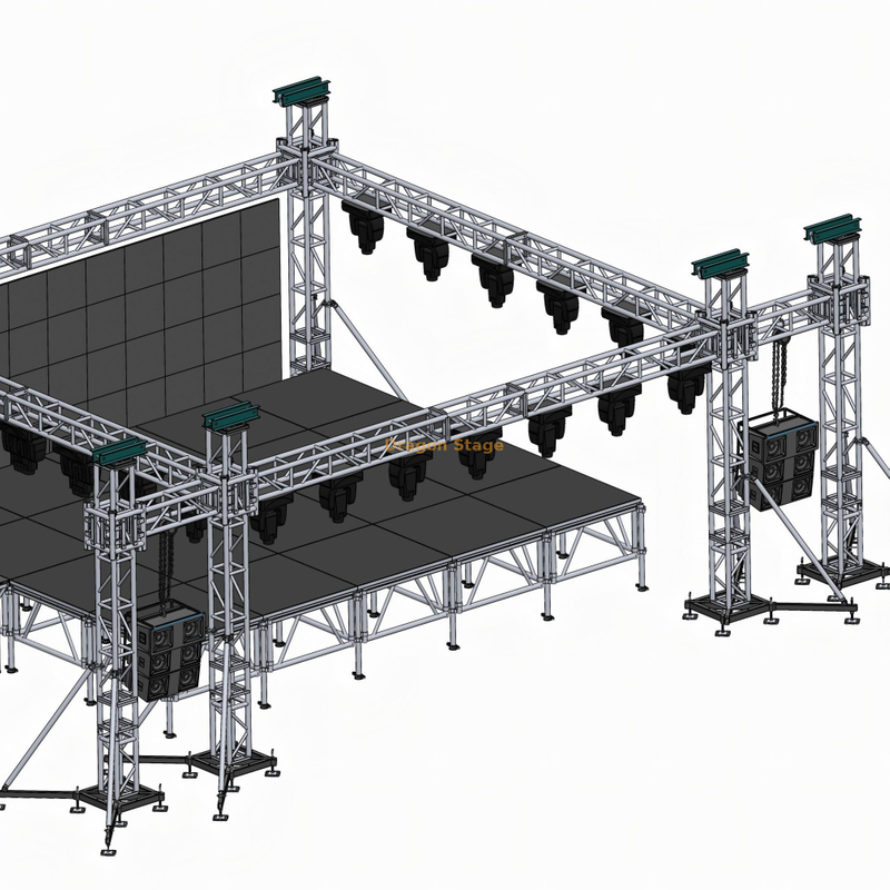 这种高度适应性的便携式铝方箱舞台桁架配置专为需要集成声音支持的专业活动而设计。该系统具有 6 米 x 6 米的主舞台面积和两个专门用于扬声器阵列的 2 米宽的附加翼,为灯光和音频提供了强大的一体化解决方案。